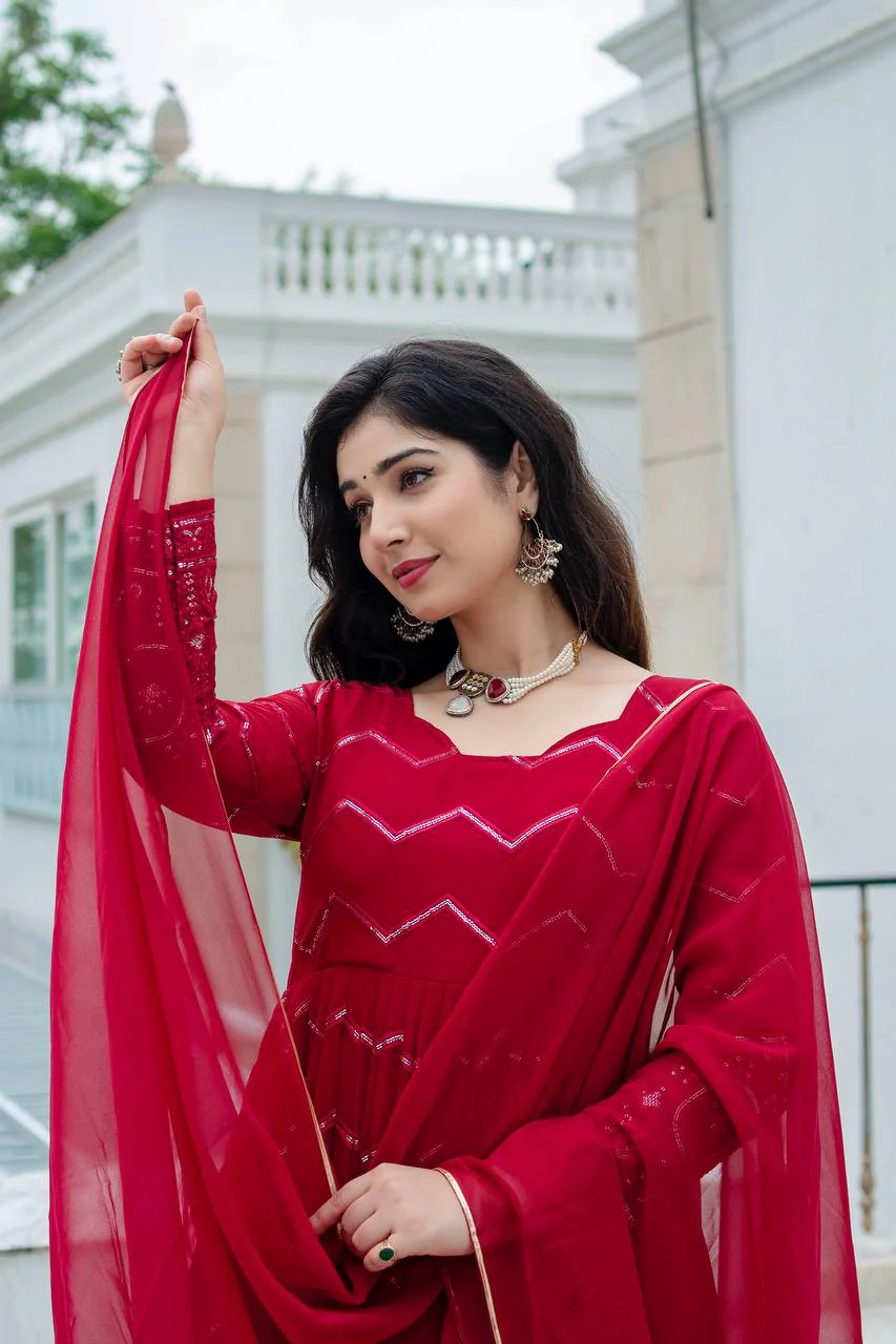 New PartyWear Beautiful Red Color Faux Georgette with all-over embroidery work Anarkali Set