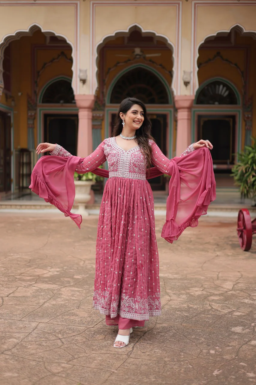 Premium Faux Georgette Sequin Embroidered Kurti Palazzo Set with Dupatta